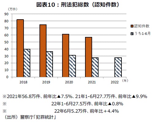 刑法犯総数の認知件数は近年減少傾向にあり、昨年は56.8万件と前年比▲7.5%の減少であった。22年1~6月の前年比は▲0.8%で、長期的な減少傾向が続いていると一応は言える。但し、月次でみると、最初の1月分前年同月比+1.8%、5月分+12.3%、6月分+4.4%と6ヵ月中3ヵ月分で増加になった(図表10)。