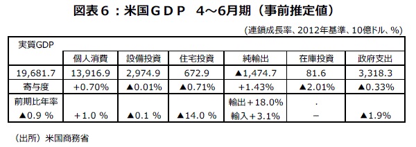 22年4~6月期の実質GDP事前推定値は、前期比年率▲0.9%と1~3月期の▲1.6%に続き2四半期連続のマイナス成長(図表6)で、見かけ上は「テクニカル・リセッション」となった。但し、在庫投資の前期比年率寄与度が▲2.01%と大きく落ち込んだ影響が大きい。