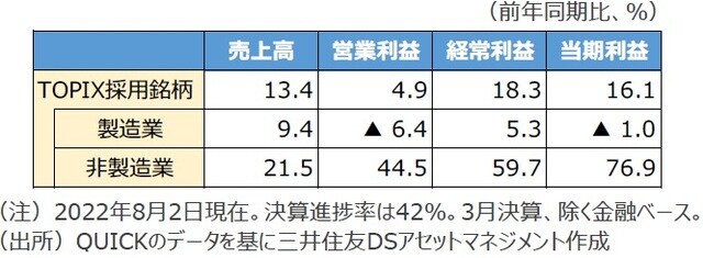 ■4-6月期の決算発表が本格化しています。8月2日現在、営業利益は前年同期比で+4.9%、経常利益が同+18.3%に達するなど決算は概ね好調です。特に非製造業の大幅増益が際立っています。