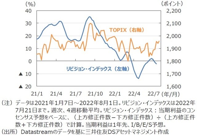 ■足元の好調な業績に支えられ、22年度の業績見通しは改善傾向となる一方、23年度の業績見通しが下方修正となっています。結果として、23年度の業績見通しも含む1年先予想利益ベースでみたリビジョン・インデックスは7月下旬以降、再び0を下回っています。TOPIXが割安圏から抜け出せない背景の1つとして、業績に対する不透明感の強まりがあると考えられます。