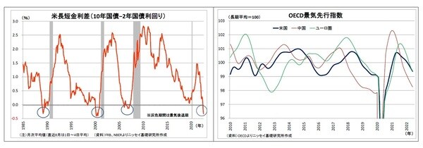また、景気を6~9ヵ月程度先取りすると言われるOECDの景気先行指数では、米国の指数が既に好不況の境目とされる100を下回っている。