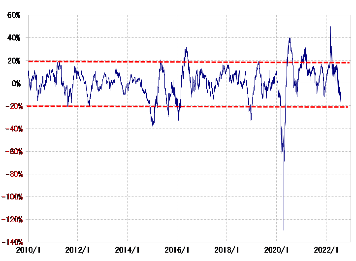 ちなみに、WTIの90日MA(移動平均線)かい離率は、足元でマイナス20%近くまで拡大してきました[図表6参照]。これでみると、先週90米ドル割れとなったWTIの下落は、短期的には「下がり過ぎ」を拡大する動きといえます。