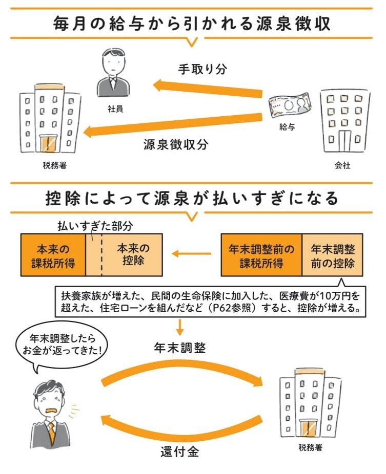 納税作業の効率化などのためにこれがありますが、仮払いした源泉所得税と実際の所得税には差が生じます。それは所得税が給与そのものではなく課税所得にかかるからです。あらたに子どもが生まれたりすると控除は増えるため、課税所得が減少します。また、昇給などによっても課税所得が変わるため、正確な所得税は1年が終わらないと計算できないのです。