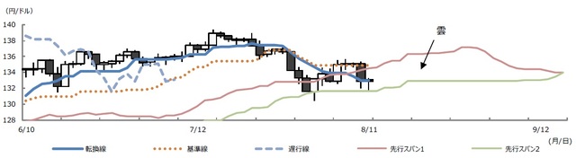 したがって、当面は、ドル円が雲の下限である先行スパン2を下抜けるか否かが焦点となります。先行スパン2の具体的な水準は、8月12日が131円68銭、15日と16日が132円05銭、17日が132円11銭で、18日から9月7日まで132円88銭です。各日において、ドル円のニューヨーク市場終値が、先行スパン2を大きく下回ると、年初からのドル高・円安トレンドは、いったん終了となる可能性が高まります。