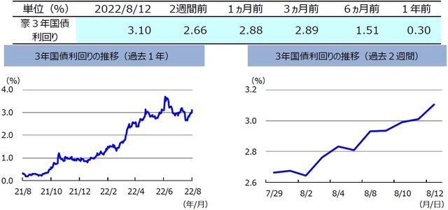 ここ2週間の豪州3年国債利回りは大きく上昇(債券価格は下落)しました。8月2日のRBAの会合で利上げが実施されたものの、RBAがややハト派的なスタンスを示したことから、豪州の3年国債利回りはわずかに低下しました。しかしその後は、FRBの高官が米利上げに強気な発言をしたことや、8月5日に発表された米国の雇用統計が市場予想よりも良好な結果だったことなどから、米国債利回りが上昇し、連れて豪州の3年国債利回りも上昇しました。
