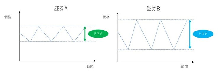 証券Aと証券Bの価格変動を表していますが、証券Bのほうが振れ幅は大きくなっています。この場合、証券Bのほうが証券Aよりも「リスクが大きい」と考えるのです。
