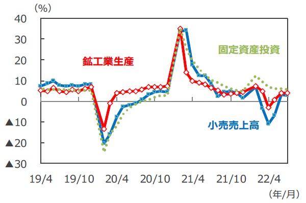 (注2)固定資産投資は年初来の前年同期比。鉱工業生産、小売売上高は前年同月比(各年2月は年初来の前年同期比)。