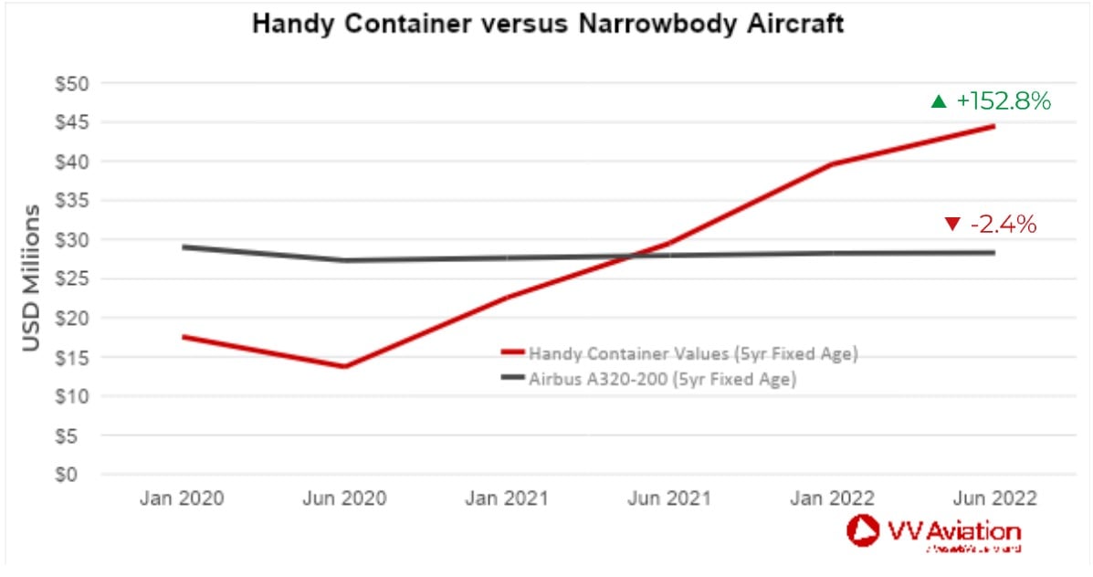 まず、最も一般的なバルク船の1つ(ケープサイズ)と、最も一般的な民間旅客機の1つ(777-300 ER)、そして最も主要な船舶であるハンディコンテナ船とA320-200航空機について2020年1月以降の価値の推移を比較する。