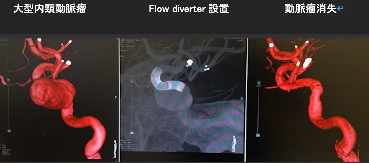 未破裂の脳動脈瘤に対する成績も非常に安定してきました。日本への導入は遅れましたが、図表4のように非常に治療が難しかった大型動脈瘤に対しても、目の細かなステントやフローダイバーター(FD)を置いて脳動脈瘤が消失させてしまうということも可能になってきました。