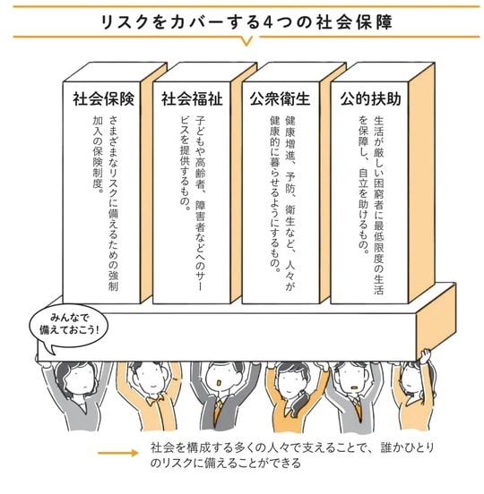 日本の社会保障は、困窮者の暮らしを支える「公的扶助」、健康に暮らせる社会を維持するための「公衆衛生」、高齢や障害などハンディキャップのある人の暮らしを支える「社会福祉」、困難に直面したときに金銭的に支えてくれる「社会保険」の4つに分けられています。