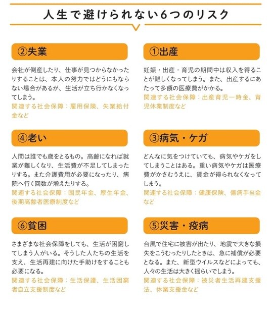 これらに加え、介護が必要になった場合に備える「介護保険」、失業した場合に備える「雇用保険」、勤務中や通勤中に病気やケガをした場合に備える「労災保険」があります。人生のなかで発生するかもしれないリスクに備える、大事な制度です。