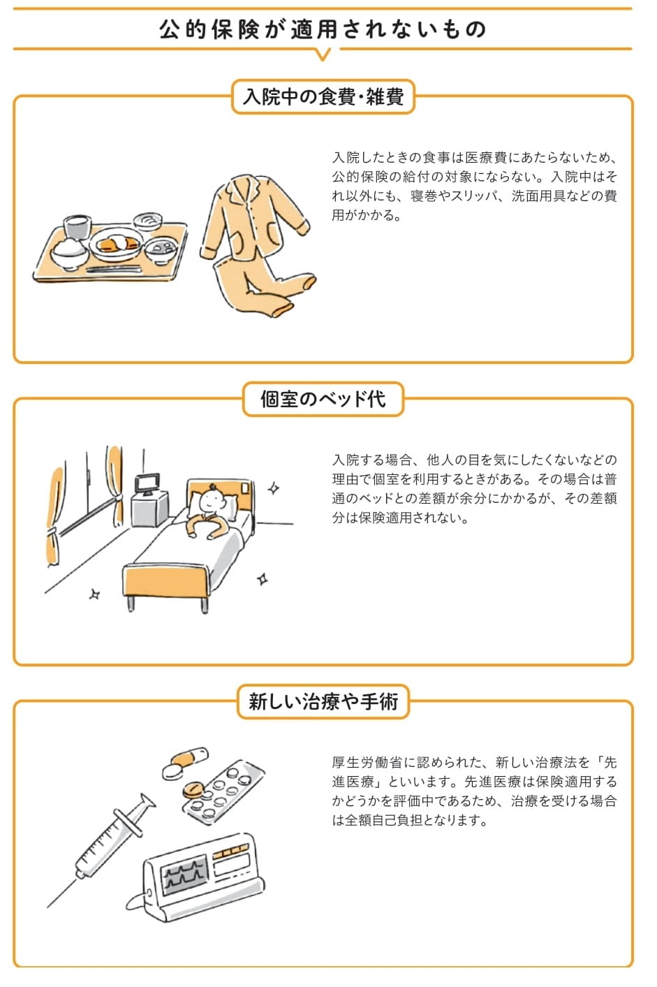 公的保険の対象になるのは医療費のみで、入院中の食費や寝巻などの雑費、個室のベッドにした場合の差額、先進医療の治療費などは対象になりません。貯蓄が少なくてそういった出費が難しい場合は、民間の保険に入っておくと安心です。月に数千円の保険料を払っておくことで、のちのちのリスクを軽減することができるのです。