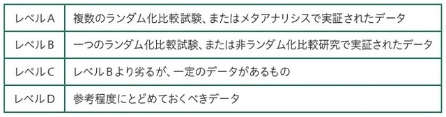 本稿ではQ&Aの根拠となる論文のエビデンス(科学的根拠)レベルをABCに分け、参考程度にとどめていただきたいDもふくめて評価しています(図表1・2参照。簡易的に分けているのであくまで目安とお考えください)。