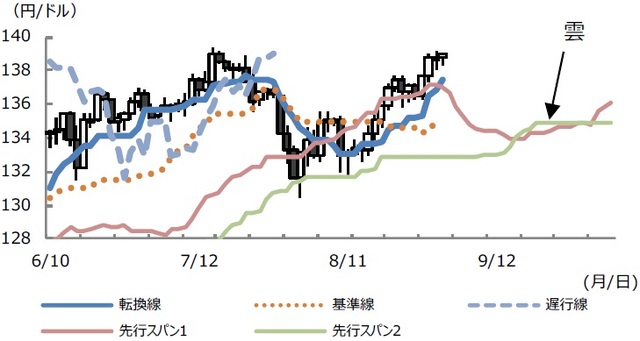 先行スパン2の具体的な水準は、8月12日が131円68銭、15日と16日が132円05銭、17日が132円11銭で、18日から9月7日まで132円88銭でした。各日において、ドル円のニューヨーク市場終値が、先行スパン2を大きく下回れば、ドル高・円安トレンドは終了となったのですが、結局、ドル円は先行スパン2がサポートとなり、ドル高・円安方向へ切り返しました(図表2)。