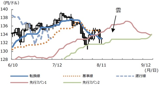 例えば、①転換線が基準線を下抜けている、②遅行線が日足を下抜けている、③日足が雲(先行スパン1と先行スパン2に挟まれた領域)を下抜けている、という3つの条件がそろうと、「三役逆転」という、非常に強い売りシグナルと解釈されます。8月12日付レポートの一目均衡表(8月11日時点、図表1)では、転換線が基準線を下抜け、遅行線が日足を下抜けており、三役逆転のうち、2つの条件がそろっていました。