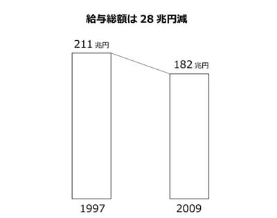 ピーク時の1997年と比較すると、2009年の給与は次のとおりだ。(1年以上勤務者・非正規雇用者含む)
