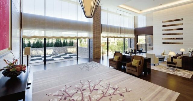 居室は約50㎡の1LDKから約150㎡の2LDKまで35プランが用意されており、夫婦で入居する方たちにも人気となっています。メインエントランスは開放感あふれるホテルのような雰囲気。入居の憩いの場でもあるラウンジは、ルーフガーデンに面し、吹き抜けからは優しい光が差し込みます。