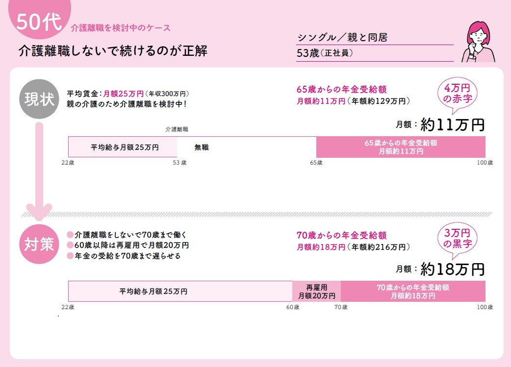 介護をしながら、再雇用で70歳まで働き、同時に70歳まで繰下げ受給をした場合、年金の月額は約18万円になります。これで老後生活も安定するでしょう。
