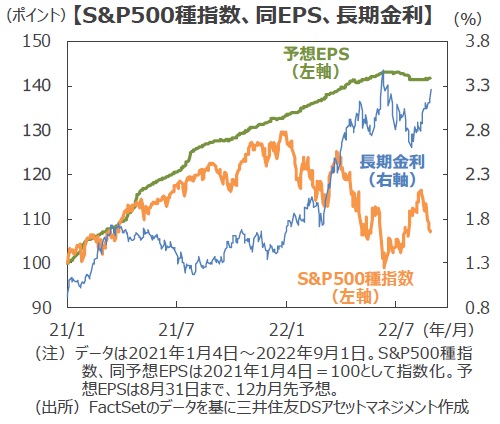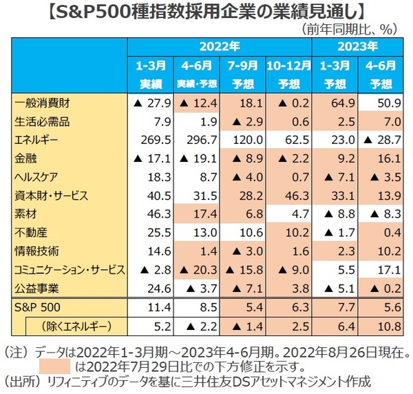 ■一方、企業業績は下方修正が続いています。S&P500種指数採用企業の22年4-6月期の増益率(当期利益)は前年同期比+8.5%、除くエネルギーセクターベースで同▲2.2%でした(8月26日。リフィニティブ集計)。また、7月末の段階で辛うじてプラスを維持していた7-9月期の増益率予想(除くエネルギーセクター)は今回同▲1.4%の減益に下方修正されました。7-9月期はヘルスケア、情報技術が減益予想に転換しました。