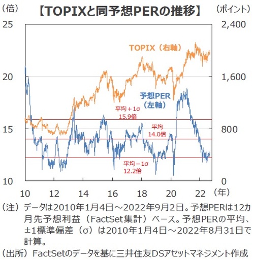 ■頭の重い日本株ですが、バリュエーションは割安圏にあります。TOPIXの予想PERは9月2日現在12.3倍と、割安圏の目安の一つである2010年1月以降約12年間の平均値から1標準偏差(σ)下方に乖離した水準に位置しています。ただ、予想PERが12倍台を付けたのは1月27日ですので、以後7ヵ月間にわたり12~13倍で推移していることになり、日本株は割安圏にとどまったままの状態とも言えます。