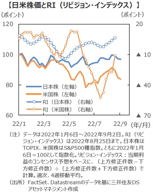 ■8月下旬以降の米国株の下落に対して日本株の下落が限定的なものにとどまっている背景として、①日本株の予想PERが割安圏にある、②日本株のリビジョン・インデックスで確認されるように、業績が緩やかな改善基調にある、といった点が指摘できそうです。過去に、予想PERが12倍台前後に留まり続けた局面は2011年や2012年、2019年などで確認され、外部環境が不透明であれば割安圏での推移は長期化しやすいと考えられます。