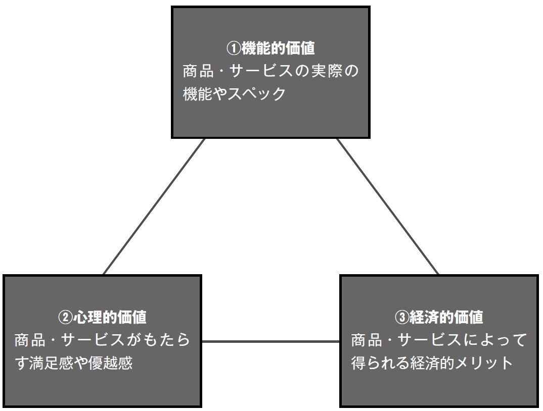 ①機能的価値とは、商品・サービスの実際の機能やスペックであり、②心理的価値は商品・サービスがもたらす満足感や優越感、③経済的価値は商品・サービスによって得られる経済的メリットです。プロローグでも触れたように消費者の価値観が「モノ」消費から「コト」消費へと移行していることに伴って、近年は①機能的価値よりも、②心理的価値、③経済的価値の比重が高まっているといえます。