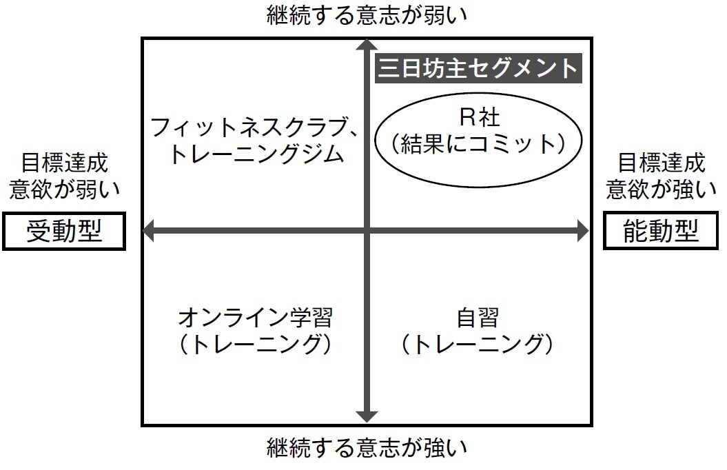 多くの人は「やせたい」「かっこいい体型になりたい」と思う気持ちはあってもそれを継続する強い意志が持てず、いわゆる「三日坊主」で終わってしまい、諦めモードになっています。「結果にコミット」という力強いメッセージとともに、高額とはいえ返金制度も用意することで安心感と信頼感を高め、「三日坊主」セグメントに所属する多くの人々の心をつかんだわけです。これをSTPのポジショニングマップに描くと下の図表3のようになります。