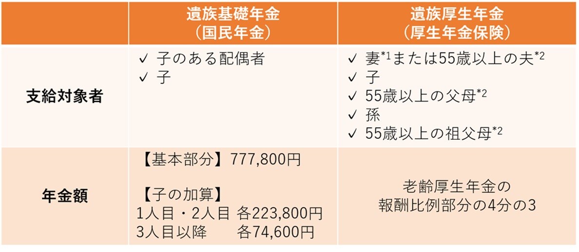 夫が亡くなり、その夫に生計を維持されていた妻や子どもがいる場合、その方たちは「遺族年金」を受取ることができます。「遺族年金」には2種類あり、「国民年金」からは「遺族基礎年金」が、「厚生年金」からは「遺族厚生年金」が支払われます。まずはその2種類の「遺族年金」の受給要件等を確認しましょう。
