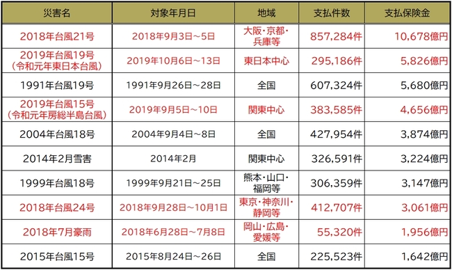 【図表1】は日本損害保険協会のデータをもとに、2022年3月末時点において、火災保険を含むすべての損害保険について、過去の自然災害による保険金の支払額が大きかった順にまとめたものです。