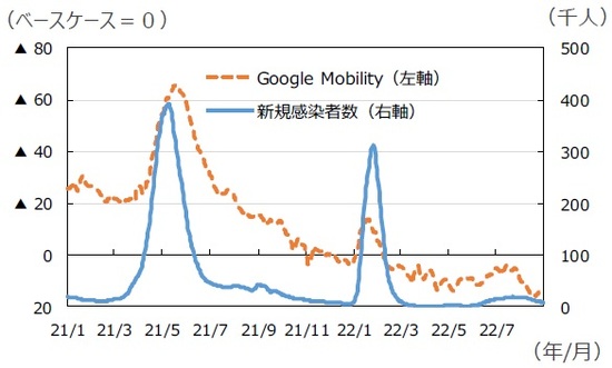 ■新型コロナウイルスの影響による、人々の移動の変化を計測する「Google Mobility(小売・娯楽)」をみると、感染者数の落ち着きとともに改善傾向が続き、コロナ禍以前の水準を回復しています。