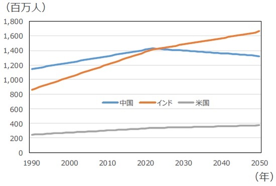 ■国連は7月、2023年にインドの人口が中国を上回り、世界最多になるとの人口推計を発表しました。中国とインドは2022年にそれぞれ14億人以上の人口を抱えていますが、インドは2050年に16億人を超える一方、中国は13億人に減少する予測となっています。インドは生産年齢人口の拡大する「人口ボーナス期」を迎えていることを示しています。