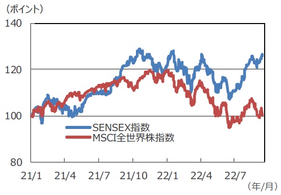 ■インド株の堅調さが際立っています。今年に入り、グローバルにインフレが加速し、米連邦準備制度理事会(FRB)をはじめとする世界の中央銀行が利上げを相次いで行ったため、世界の株式市場は大きく調整しました。MSCI全世界株指数は、6月に一時20%を超える下落幅となりました。その後反発しましたが、8月のジャクソンホール会議でのパウエルFRB議長発言により米金融引き締めが長期化する見通しが強まり急反落するなど、値動きの荒い展開となっています。こうしたなか、インド株は過去最高値に迫る堅調な展開となっています。