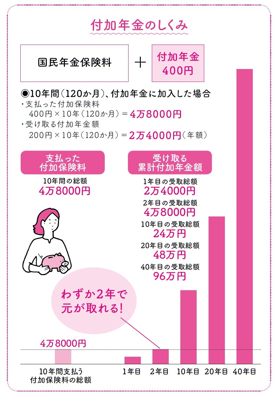 付加年金の最大の魅力は、受け取りはじめてからなんと2年で元が取れてしまうこと。それ以降はずっとお得が続き、長生きすればするほどプラスが積み上がっていきます。さらに、基礎年金を繰下げ受給すると、付加年金の受給額も同じように増額されます。