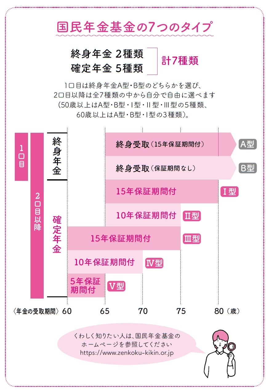 加入は口数制になっています。何口入るかは自分で決めることができ、その口数によって受け取る年金額が変わります。給付の形は、終身年金、受給期間が定まっている確定年金など、7種類から選べます。自由に組み合わせられますが、長寿時代であることを考えると終身年金がおすすめです。