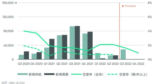 2023年は2022年を上回る規模の供給量が予定されているが、プレリーシングは少しずつ進んでいる。空室率は急上昇したものの、実質賃料は3,590円/坪で対前期比横ばいを維持した。