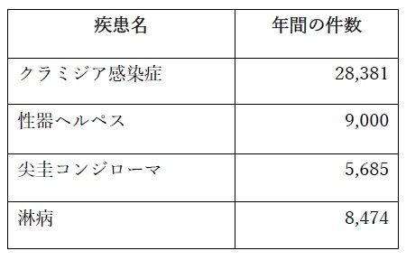 性病の中でもクラミジアは世界で最も多く、前述のように単に性器の病気というだけにとどまらないため、注意が必要です。981医療施設が参加した令和2年の定点調査では男女を合わせた総数で28,381件と記録されています。同条件で他の性感染症の年間件数と比較すると、圧倒的にクラミジア感染症が多いことがわかります(図表1)。
