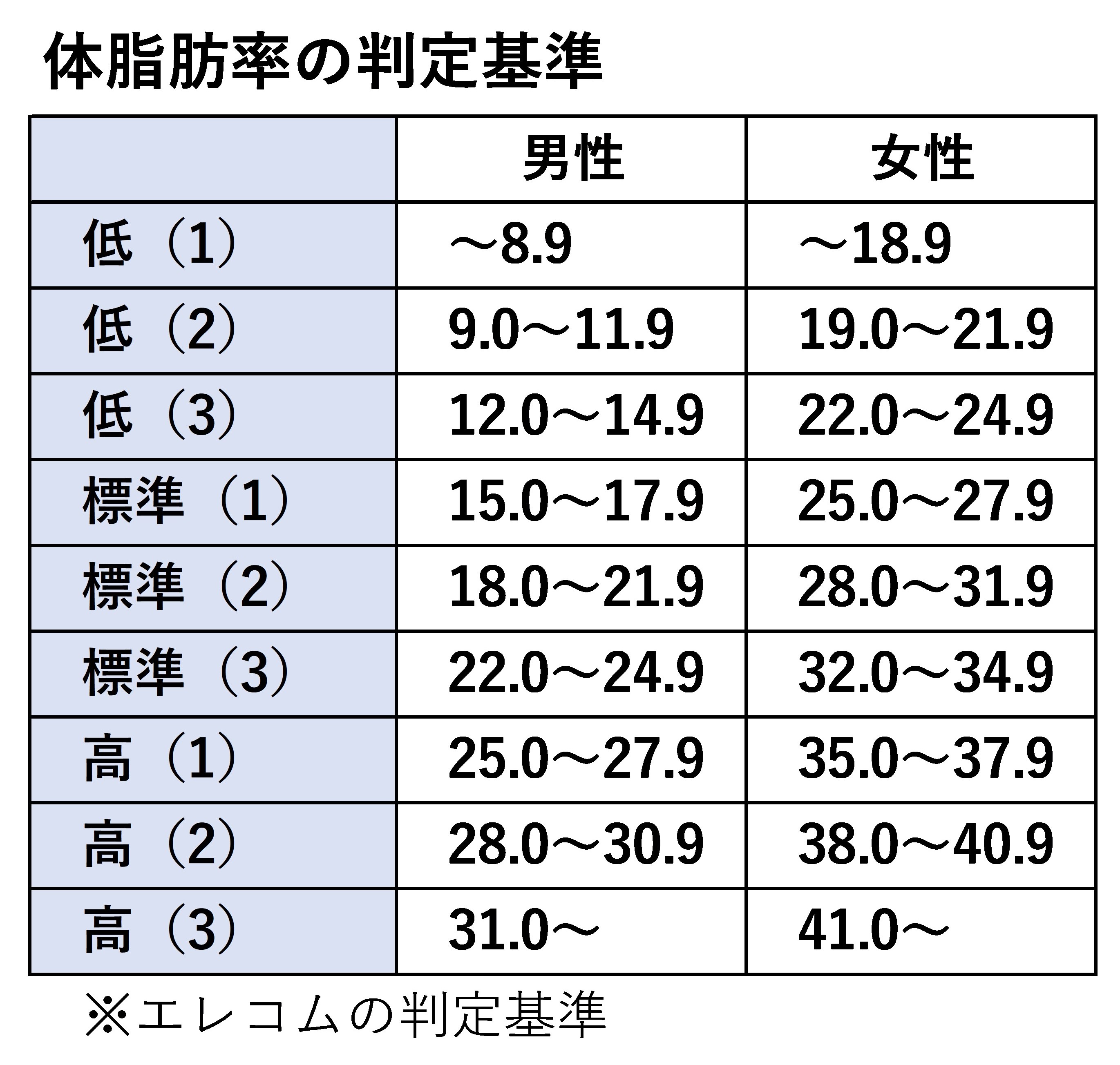 体脂肪率とは、全体重に占める脂肪の割合を表した数値です。体組成計では、直接体脂肪の重さを量っているわけではありません。「脂肪は電気を通しにくく、筋肉は電気を通しやすい」という特性を利用して、体内に流した微弱な電流への電気抵抗値(電流の流れにくさを示した値)とユーザー情報と体重から推定しています。