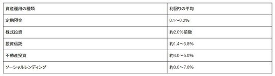 資産運用の種類別の平均利回りの目安は以下の通りです。