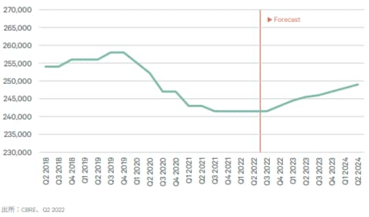 銀座ハイストリート賃料は、3期連続横ばいの24.15万円となった。今後、賃料は2022年Q3にかけて今期の水準で底這いし、2022年Q4には0.6%上昇すると予測する。ハイストリートの募集物件では、前期に比べてリテーラーからの引き合いは増えている。一方、出店の条件交渉などでテナントの内定にはやや時間を要している。