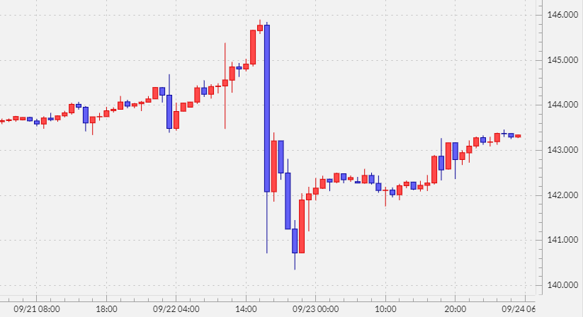 先週の米ドル/円は、21日のFOMC(米連邦公開市場委員会)を受けて米ドル高値を更新、一気に146円に迫るところとなりました。ただ、これに対して22日、24年ぶりの米ドル売り・円買い介入出動となったことから、一転して140円割れ近くまで米ドル急落となる場面もありました(図表1参照)。