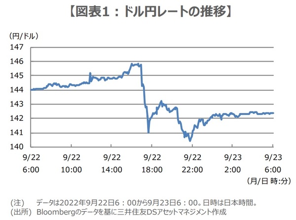 政府・日銀は9月22日、1998年6月以来、約24年ぶりとなるドル売り・円買いの為替介入に踏み切りました。この日は午後3時半から日銀の黒田東彦総裁の記者会見が行われましたが、金融緩和維持の強い姿勢が確認されたことで、ドル円は午後4時頃に1ドル=145円90銭近くまでドル高・円安が進行しました(図表1)。為替介入はこれを受け、午後5時頃に実施された模様で、その後は140円35銭付近までドル安・円高が進みました。