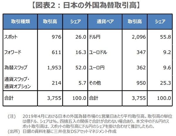 日銀の調査によると、日本の外国為替市場の1営業日あたり平均取引高は3,755億ドルです(図表2)。