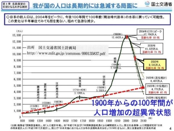 このまま移民政策などを採用しなければ、100年後は5千万人に舞い戻るのはほぼ確実である。今、ジェットコースターに例えれば、その高見を通過中であり、これからまさに急降下するときである。