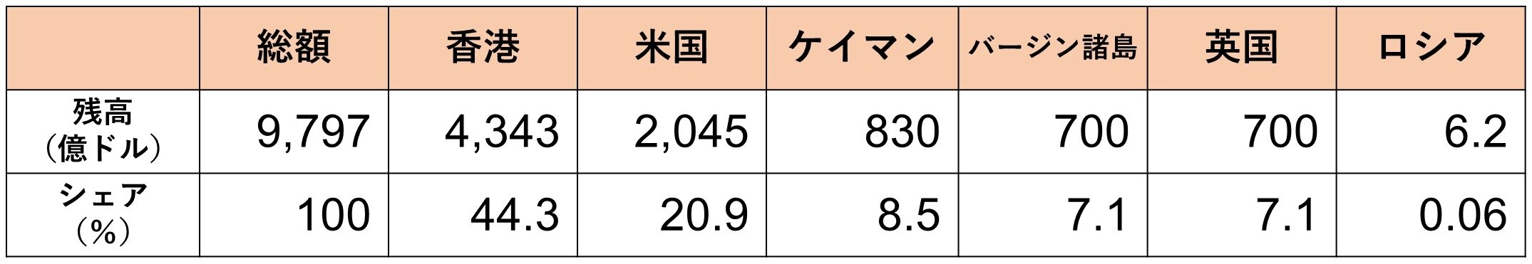 中国の対外証券投資は香港、米国、タックスヘイブン地域で8割以上。投資主体は非銀行金融機関、非金融部門、銀行で、各々2021年末投資残高9797億ドルの40%、36%、24%を保有している。対ロ証券投資は2021年末残高6.2億ドル、全体の0.06%にすぎない。その7割弱が株式で、これは他国・地域と変わらない。
