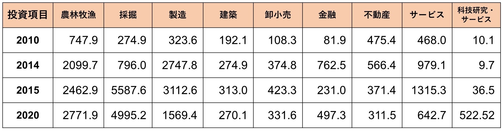 投資分野は同地域を中心に、エネルギー関係、農林牧畜・漁業分野が主だが、自動車、家電、食品加工にも中国の資金が入っており、また投資形態は従来のグリーンフィールド投資から、買収や基金設立に移りつつある(2022年9月7日付環球時報)。