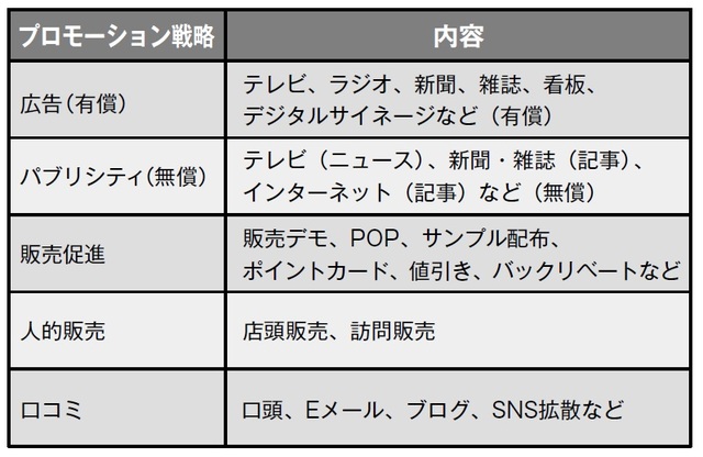 プロモーションの具体的な方法としては①広告、②パブリシティ、③販売促進、④人的販売、⑤口コミがあげられます。プロモーション戦略ではこれらの販促手段の効率的な組み合わせを策定することが求められます。