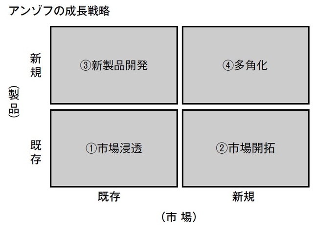 それぞれの軸はさらに「既存」と「新規」に分けられ、①市場浸透、②市場開拓、③新製品開発、④多角化という4つの成長の方向性が示されます。それぞれの概要は以下のとおりになります。