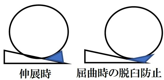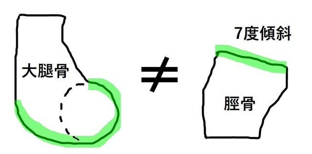 一方、脛骨関節面は平面形状で約7度後方に下がっていますので、坂道といえます(図表1右)。脛骨が7度傾いているのは、膝の前方脱臼防止と正座、しゃがみ込みなどの深く曲げる動作に好都合だといわれています。しかし、膝の力学的安定性には不都合です。なぜなら、坂道では車輪が後方に滑ってしまうからです。