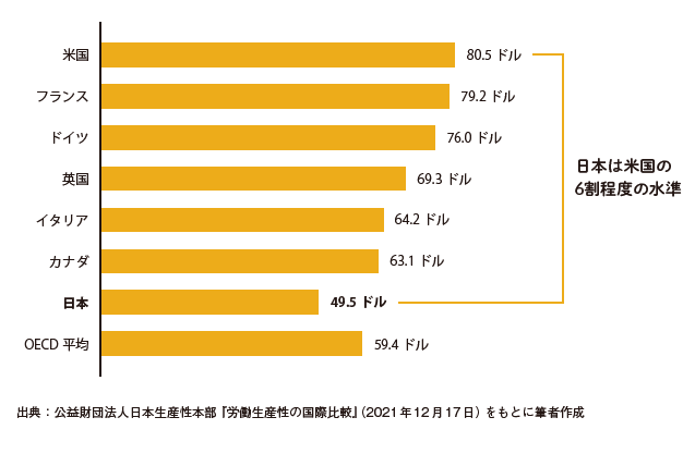 日本の労働生産性は、残念ながら高いとはいえません。OECD(経済協力開発機構)のデータによると、2020年の日本の「1時間あたりの労働生産性」は、米国の約6割にあたる49.5ドルにすぎません(図表3)。OECD加盟38カ国中では23位、主要先進7カ国との比較では、データが取得可能な1970年以降、現在に至るまでつねに最下位です。