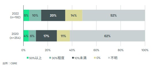 「0%」と回答した企業を含めると、割合はそれぞれ約6割と7割に上る。つまり、オーナーがコストをかけて物流施設の環境性能を高めても、現状ではそのコストを回収することが必ずしも容易ではないことを示唆する結果となった。